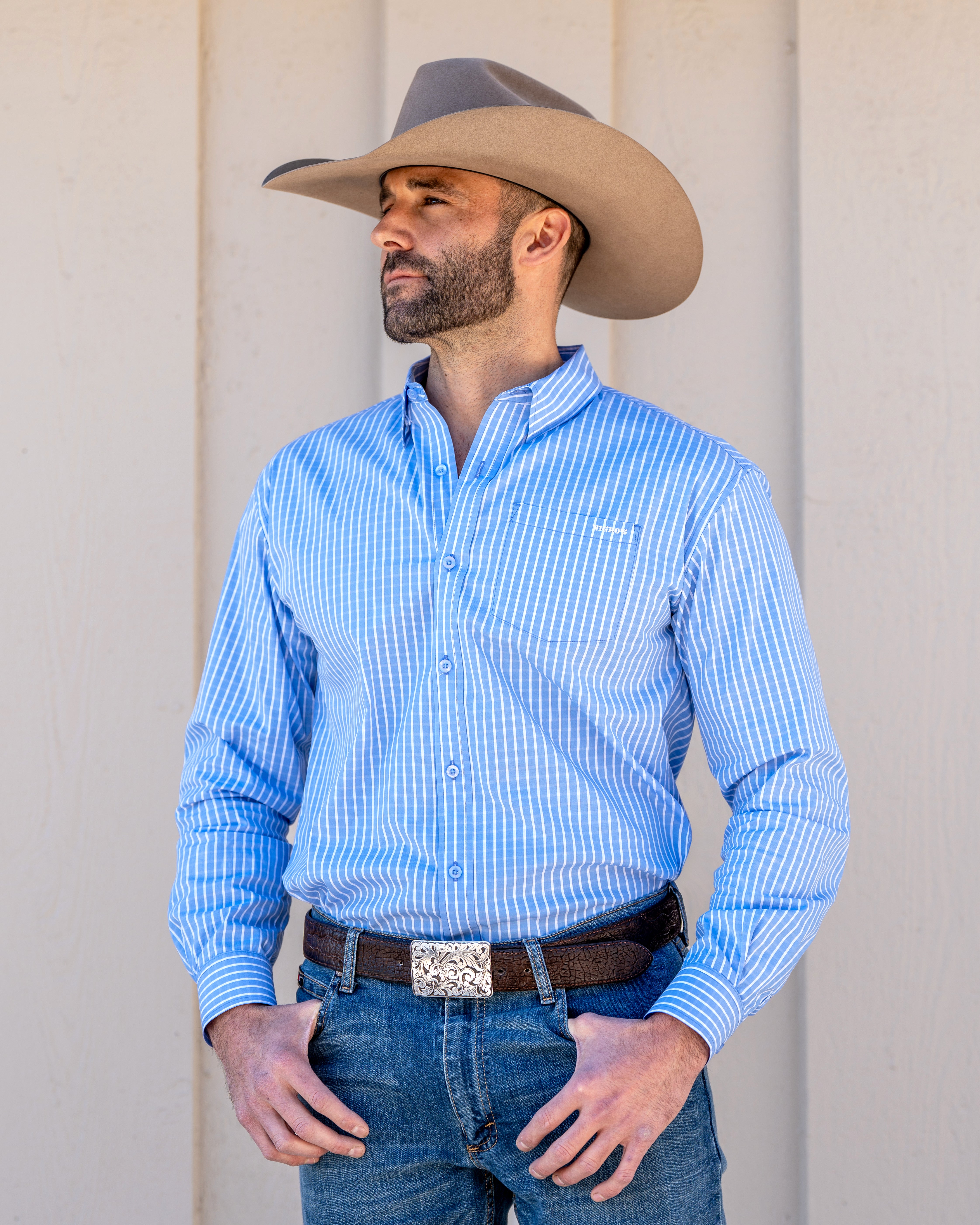 This exclusive navy and white gingham shirt from Nigro's Western Store features a classic western yoke and a single flat pocket adorned with the elegant "Nigro's" logo. Crafted from a comfortable 80% cotton and 20% polyester blend, it offers a soft feel on the skin, easy care, and retains a crisp appearance after washing or holding that cowboy starch. White flat buttons complete the authentic western style with durability and subtle charm. Perfect for those seeking both style and practicality in western wear.
