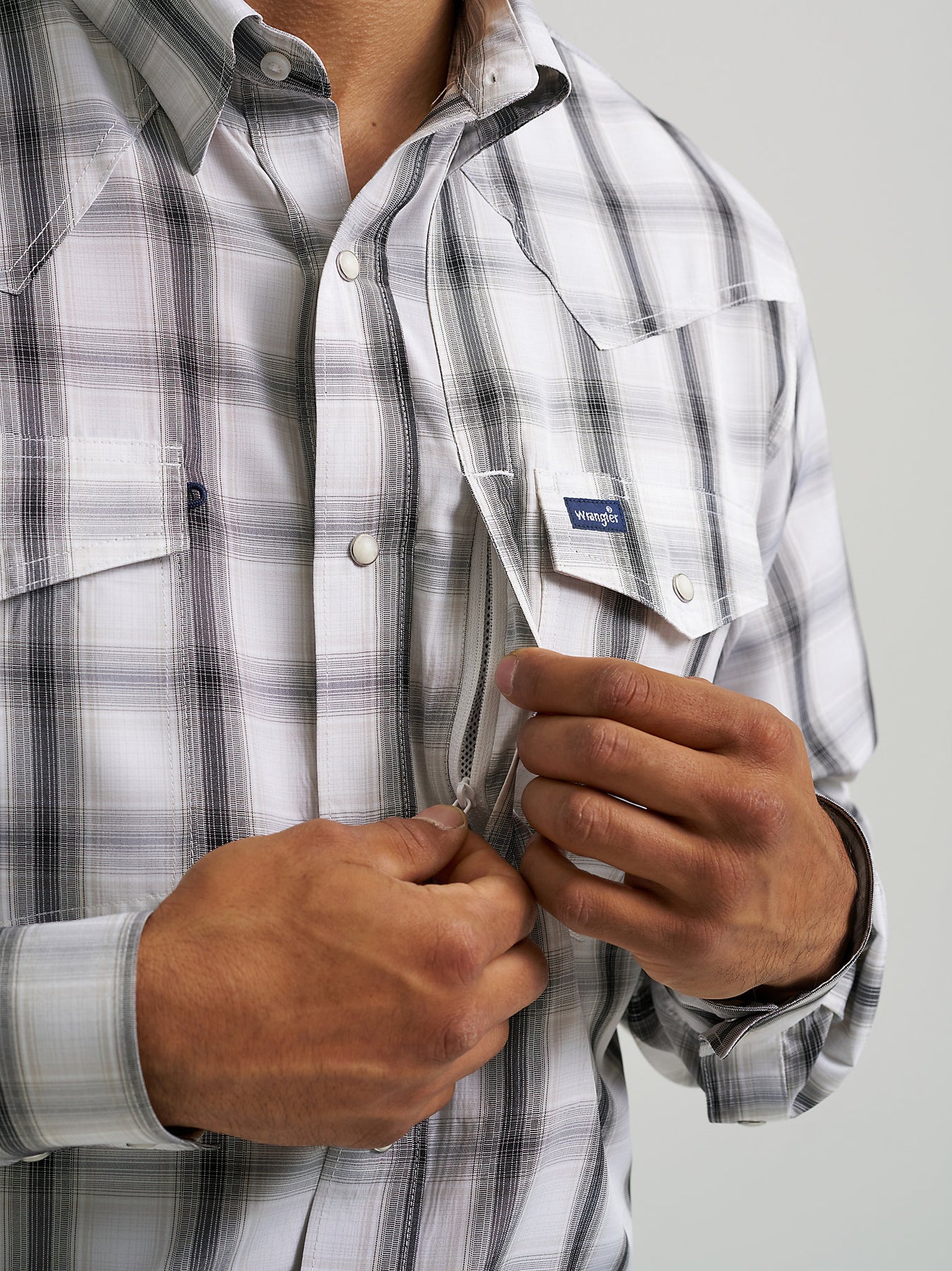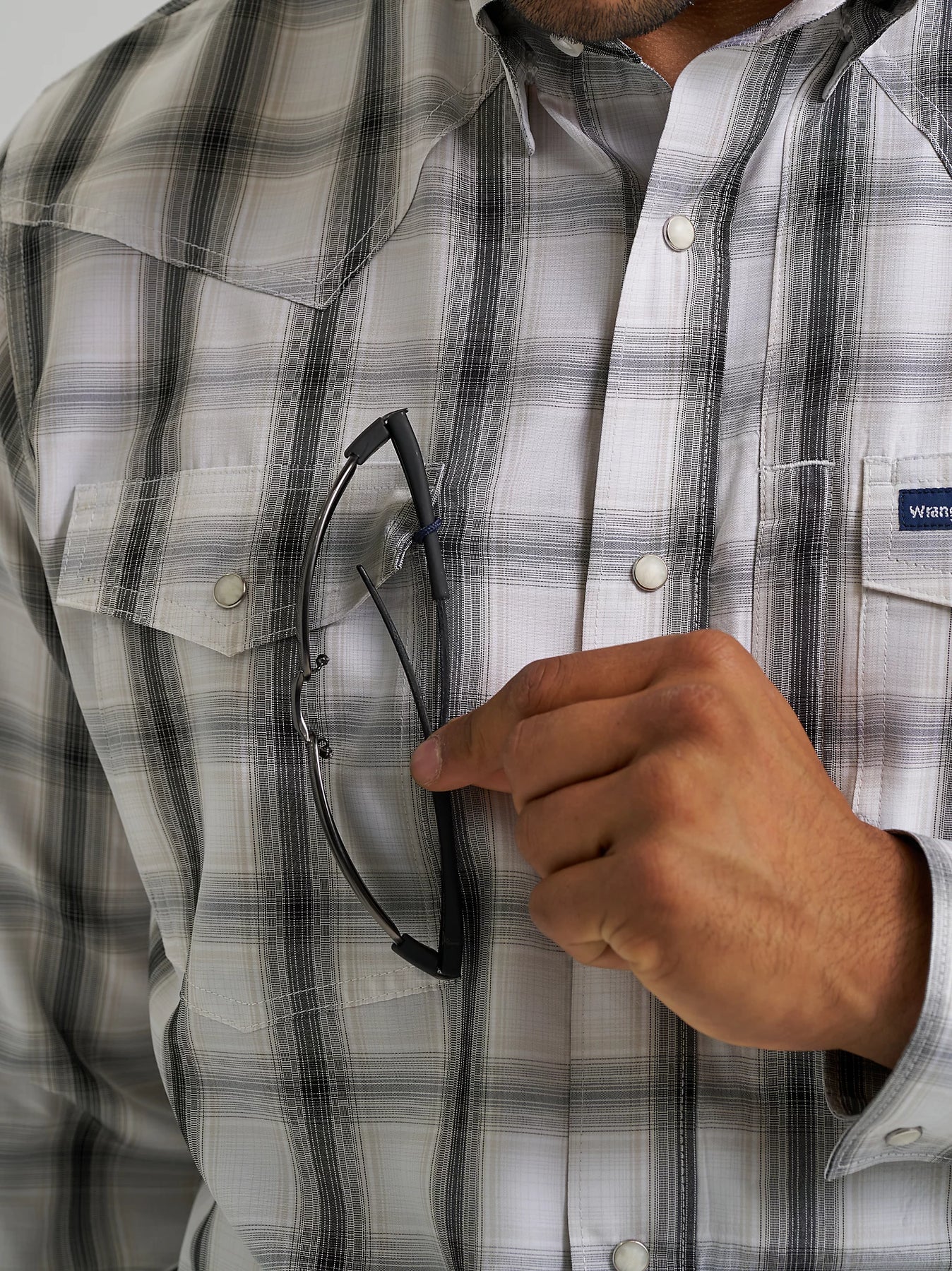 All the western styling you love and want with the performance features you need. This long-sleeve plaid snap shirt comes fully equipped with UV protection and a moisture-wicking finish to keep you protected from the elements. This classic fit shirt comes with pointed yokes and a full snap closure as well as a hidden snap-down collar to keep you looking polished and ready for whatever the day brings. A hidden back vent makes this shirt even more breathable and built-in sleeve keepers make it easy to adjust your look on the fly. Between the two chest pockets and zippered Napoleon-style pocket on the left, you’ll have plenty of storage space for your essentials. Plus, it comes with a glasses cleaner at the hem to keep you smudge-free. Wear it with your favorite pair of Wrangler Retro® or 20X® jeans to complete the outfit