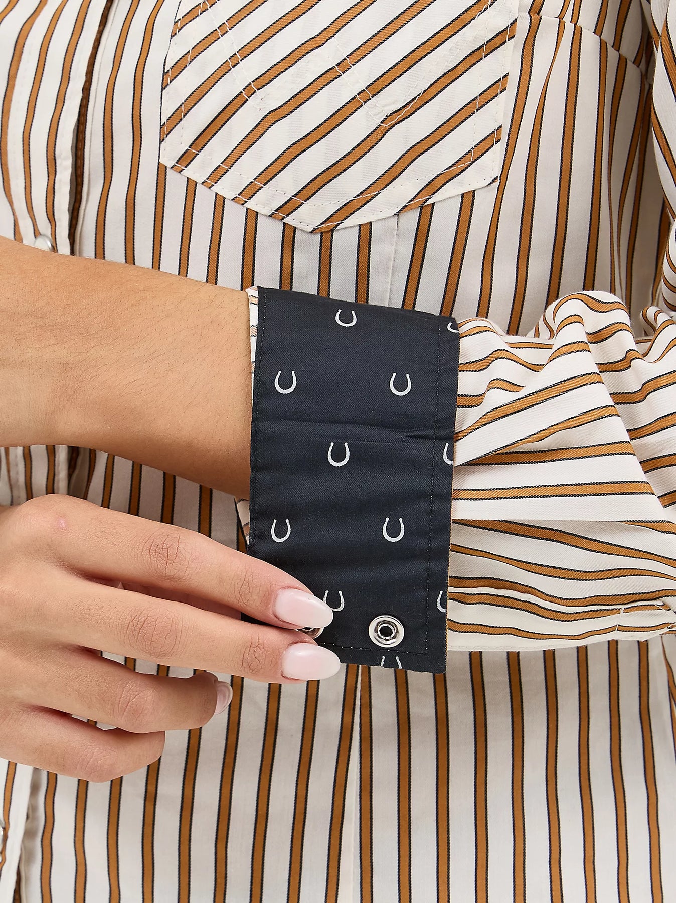 A cowgirl can never have too many collared shirts for competition and daily life. Our Women's Wrangler Retro® All-Occasion Western Snap Dress Shirt is crafted a lightweight cotton and recycled materials blend that will keep you comfortable in everything you do. It comes with pointed yokes, pearl snaps, two chest pockets with the signature "W" stitching, and a contrast print at the cuffs.