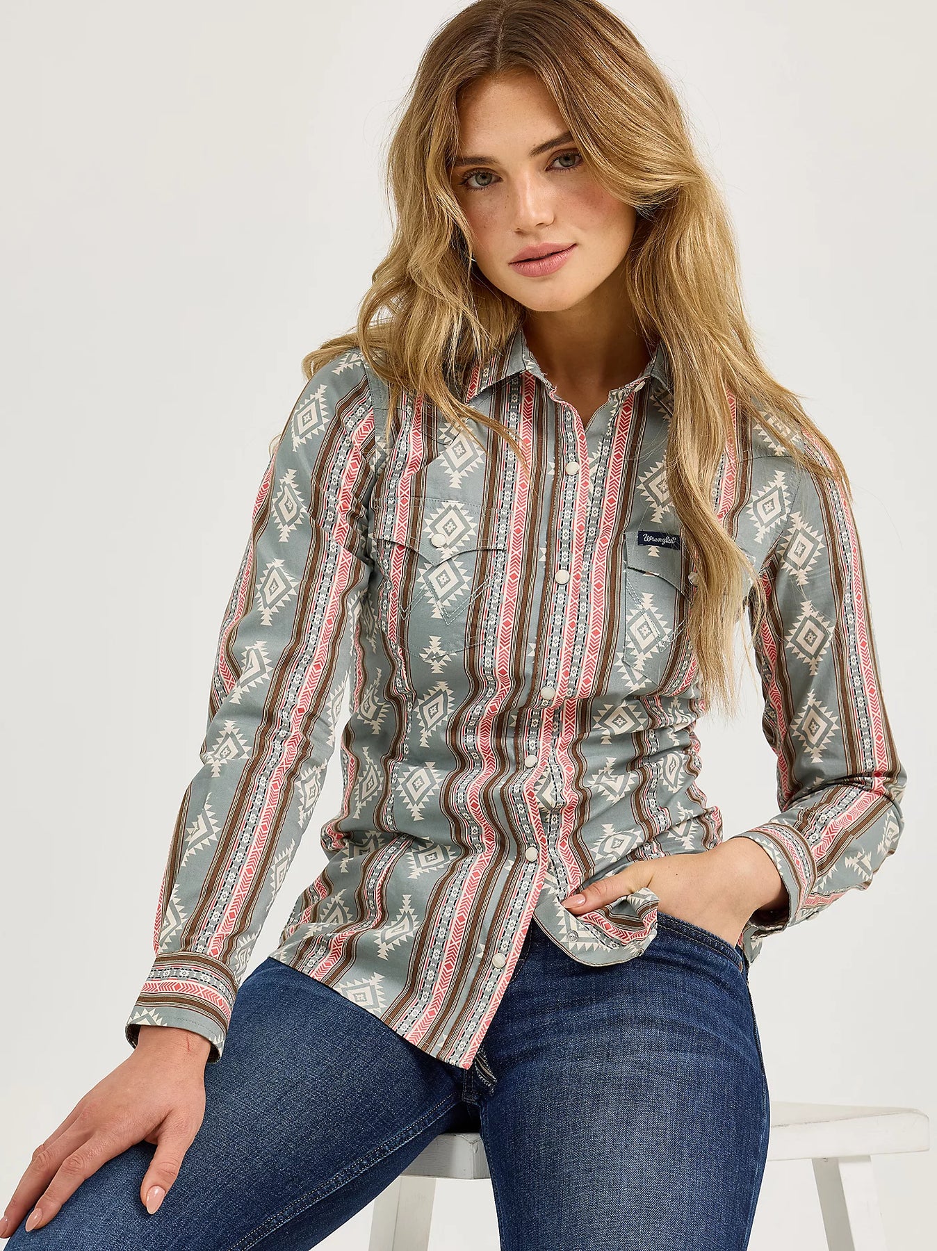 It's the details that make every Wrangler® Western shirt iconic. This women's Western shirt is complete with all the features you know and love, including one-point front and back yokes, snap flap sawtooth chest pockets, an authentic southwestern print in a striped pattern, pearl snap buttons, and a classic color scheme. The timelessly stylish shirt has a soft, breathable feel and a comfortable construction you can wear no matter the season.