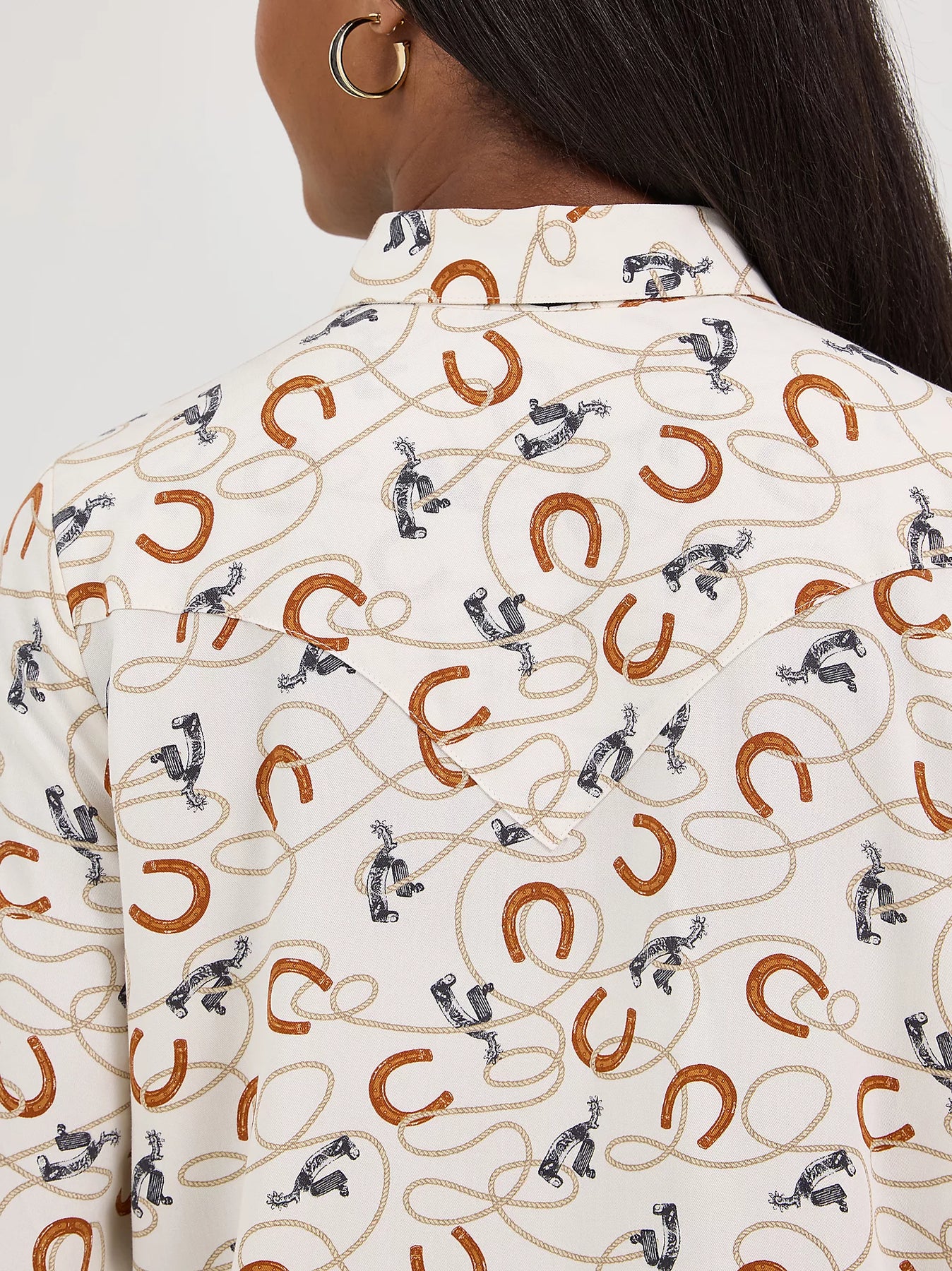Elevate your Western look with our Women's Tie Neck Blouse. It’s made of a soft and breathable fabric you can wear from one season to the next. This classic collared shirt really ups the ante with ties at the neck you can wear in a ladylike bow or leave long and loose to match the mood. Plus, it’s finished with a cowgirl-friendly print full of horseshoes, rope, and spurs.