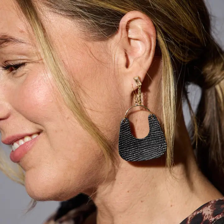 Timeless meets a new modern and sleek silhouette in the Noras. These leather earrings are made with our textured black croc leather and are the perfect way to add eye-catching texture in a neutral color to any outfit.