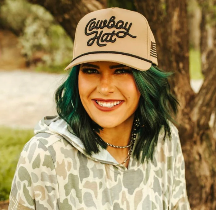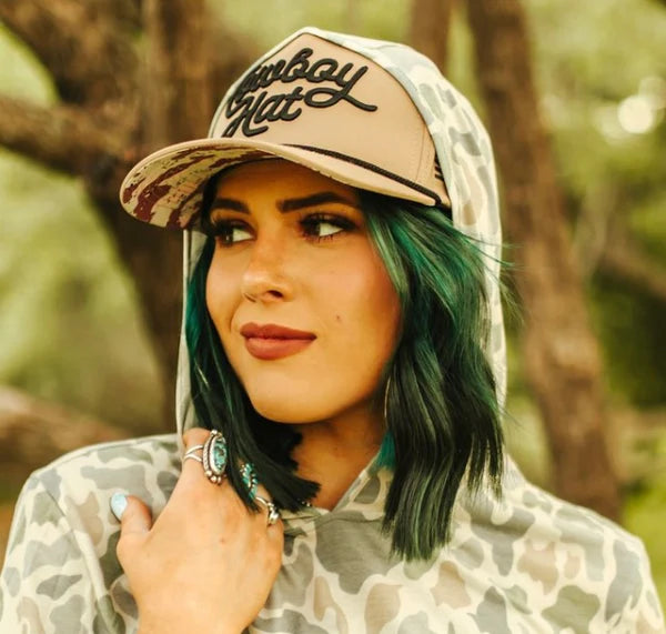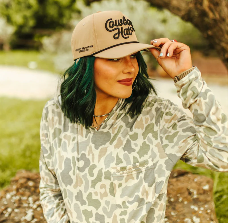 Introducing the "Sandstorm Veteran" Cowboy Hat (Rope Option) by Cowboy Revolution Apparel Co. This tan & desert camo poly-spandex trucker hat embodies American pride and the spirit of the United States Military Veteran.