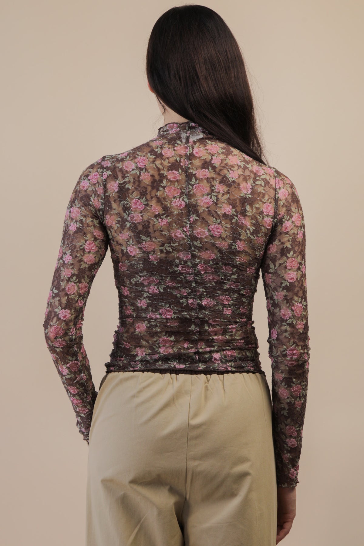 - High Neck Fitted Sheer Mesh Lace Knit Top